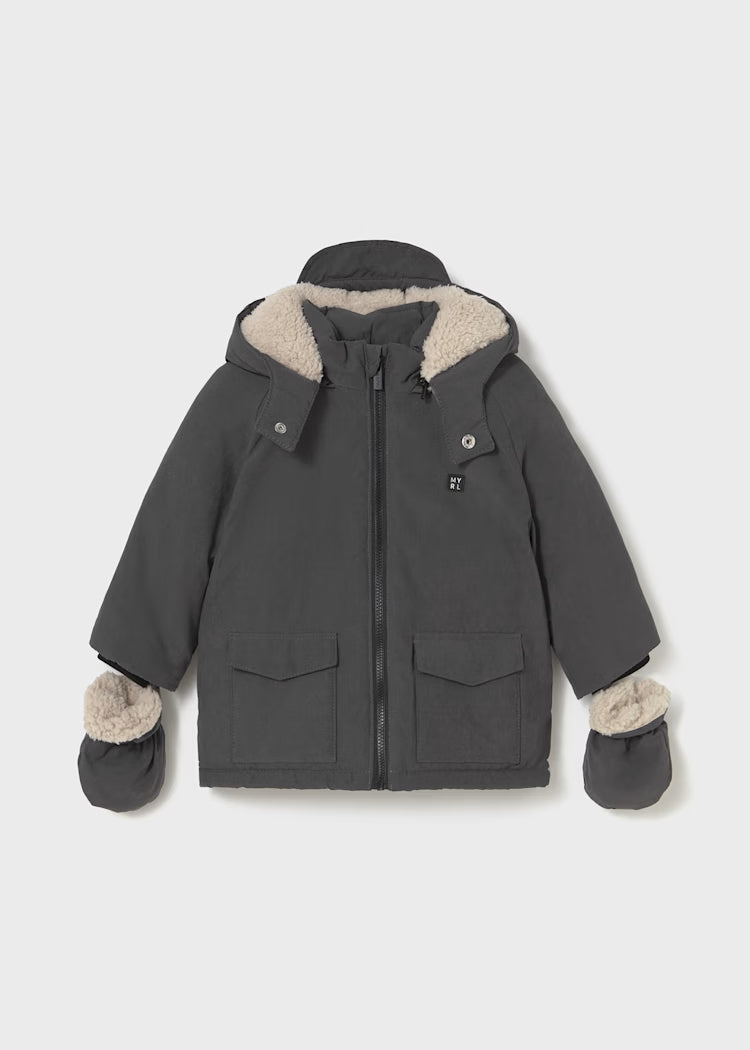 Chaquetón de manga larga para bebé con puños elásticos. Cuello envolvente. Cuello con capucha desmontable. Cierre con botones en la parte delantera. Cierre central delantero con cremallera. Combinación de tejidos cálidos para el forro interior. Bolsillos funcionales en la parte delantera.