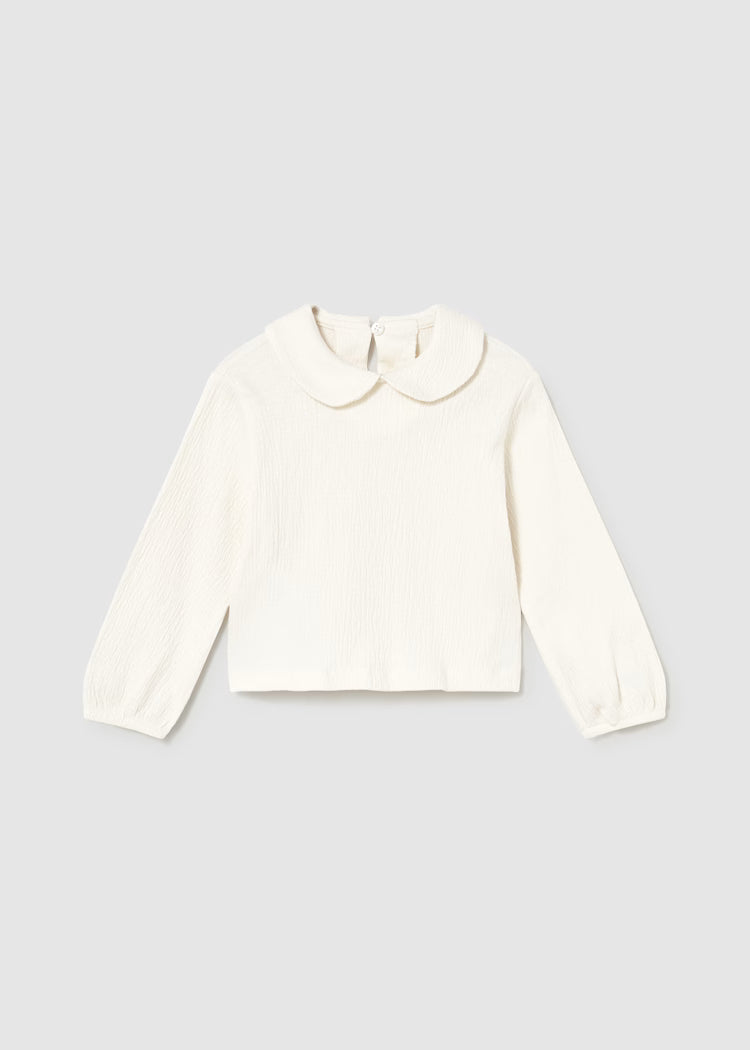 Camiseta de manga larga para bebé. Cuello bebé. Pequeña abertura en la espalda con cierre de botón para facilitar la puesta de la prenda. Modelo con rizo. Bajo elástico para un mejor ajuste.