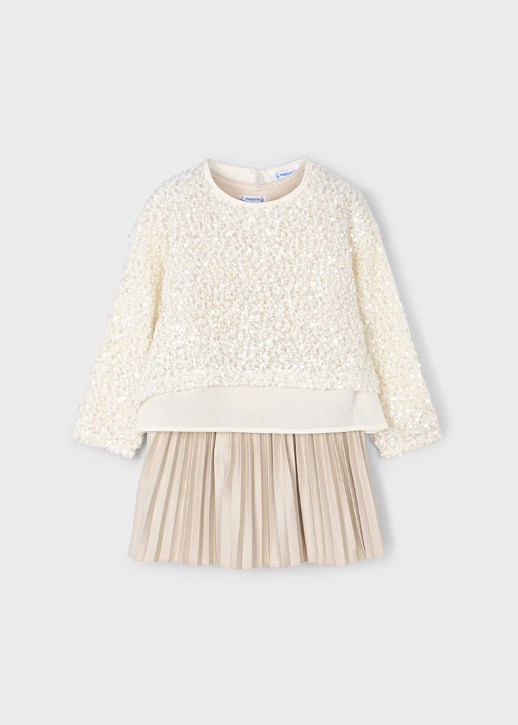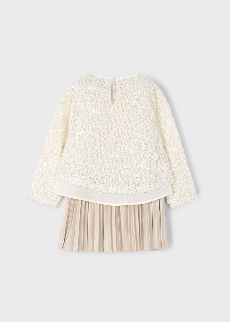 Blusa de manga larga para niña. Cuello redondo. Diseño simulado con prendas en superposición. Abertura con botón en el cuello para facilitar la puesta de la prenda. Elementos de adorno: lentejuelas.