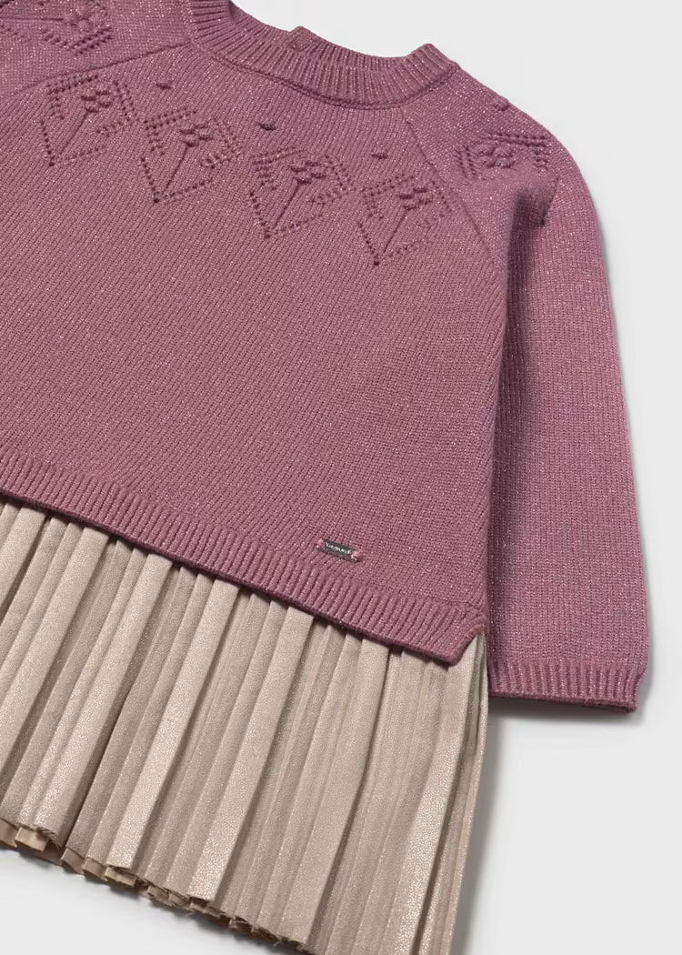 Vestido de manga ranglán para bebé. Cuello redondo. Diseño simulado con jersey en superposición. Cierre con botones en la espalda para facilitar la puesta de la prenda. Tejido de punto tricotosa de tacto suave y agradable.