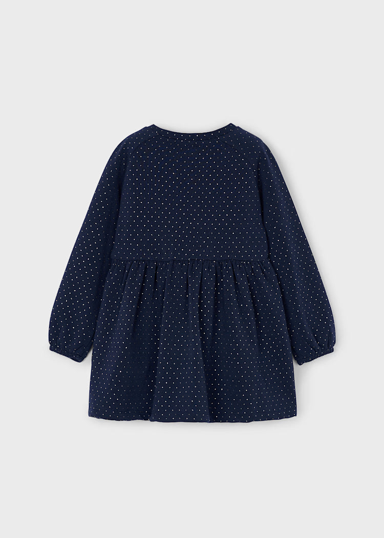 Vestido de manga ranglán para niña. Modelo con cuello barco. Cálido tejido de felpa gruesa (felpa perchada), perfecta para los meses fríos. Modelo con rizo.