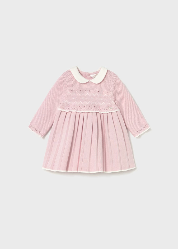 Vestido de manga larga para recién nacida. Cuello bebé. Cierre con botones en la espalda para facilitar la puesta de la prenda. Tejido de punto tricotosa de tacto suave y agradable. Modelo con tableado. Dibujos en punto jacquard.